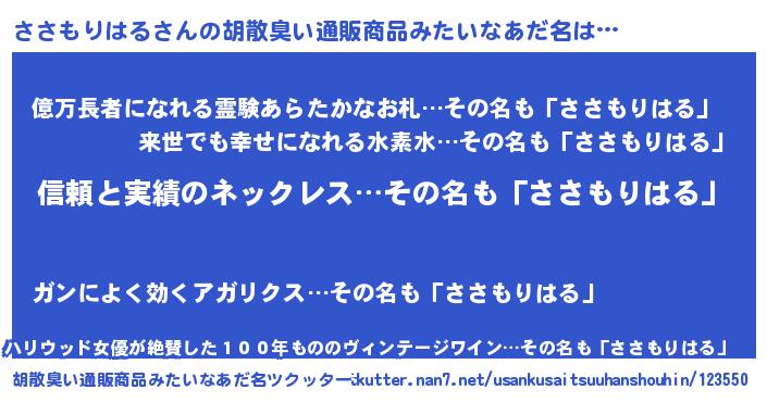 | 男性向けラノベタイトル風あだ名 | 『ダンジョンにささもりはるを求めるのは間違っているだろうか』 |