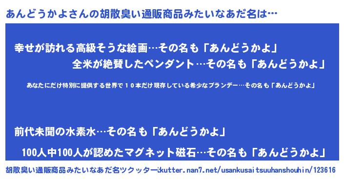 | 意味不明あだ名 | 『住所不定無職あんどうかよ(77歳)』 |