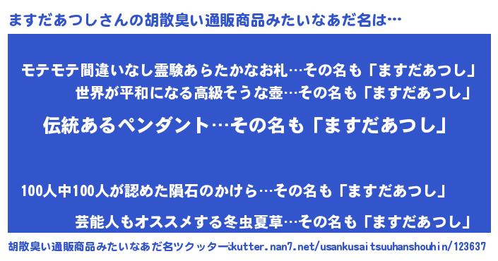 | 男性向けラノベタイトル風あだ名 | 『ダンジョンにますだあつしを求めるのは間違っているだろうか』 |