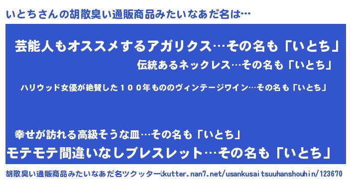| 意味不明あだ名 | 『住所不定無職いとち(3歳)』『自称いとち』 |