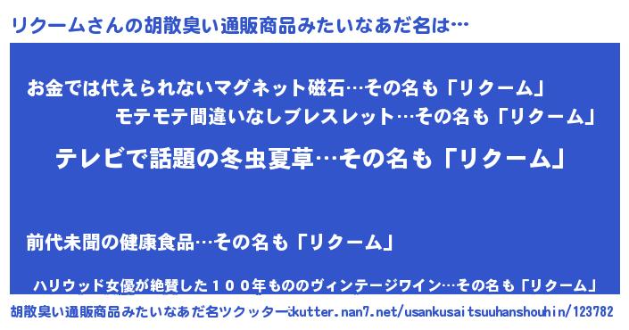 | 意味不明あだ名 | 『自称リクーム』『なめこ科リクーム属』 |