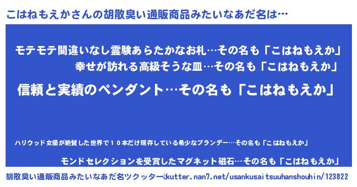 | 男性向けラノベタイトル風あだ名 | 『ダンジョンにこはねもえかを求めるのは間違っているだろうか』 |