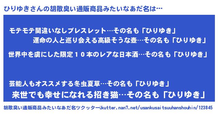 | 男性向けラノベタイトル風あだ名 | 『この素晴らしい世界にひりゆきを!』 |