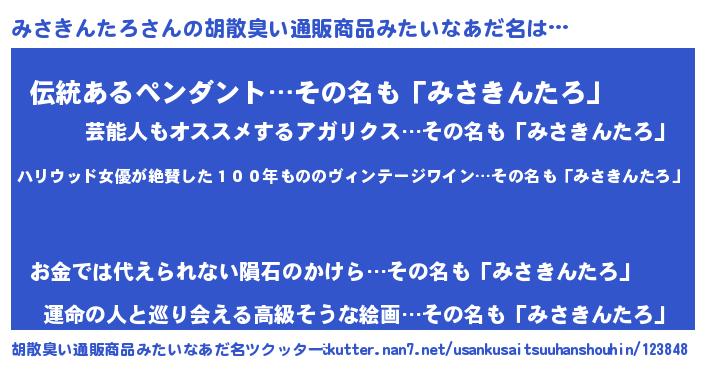 | 男性向けラノベタイトル風あだ名 | 『魔弾の王とみさきんたろ』 |