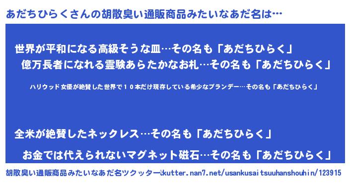 | 意味不明あだ名 | 『住所不定無職あだちひらく(79歳)』 |