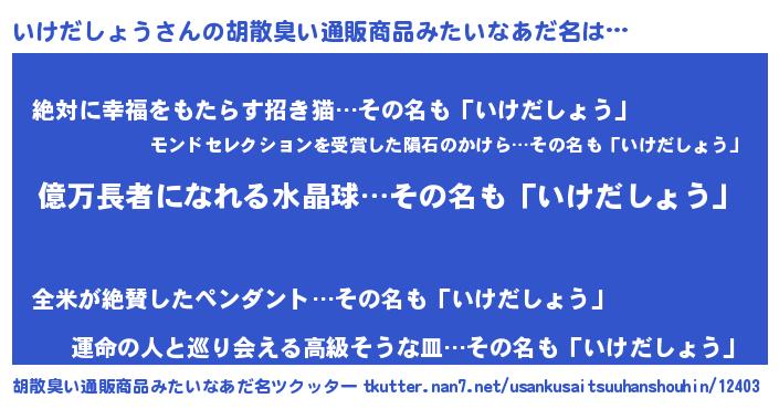 | 男性向けラノベタイトル風あだ名 | 『いけだしょう~年齢イコール彼女いない歴の魔法使い~』 |