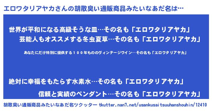 | 意味不明あだ名 | 『住所不定無職エロワタリアヤカ(10歳)』 |