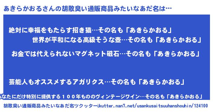 | 男性向けラノベタイトル風あだ名 | 『おまえをオタクにしてやるから、俺をあきらかおるにしてくれ! 』 |