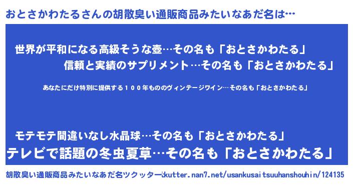 | 男性向けラノベタイトル風あだ名 | 『この素晴らしい世界におとさかわたるを!』 |