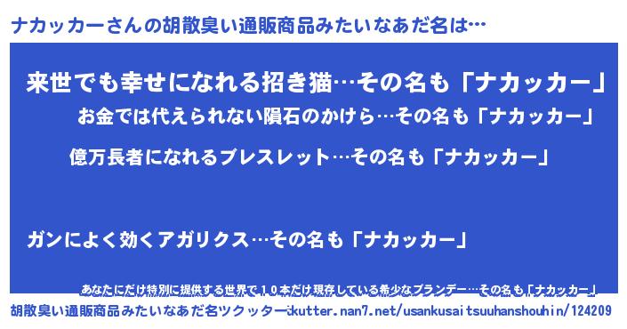| 男性向けラノベタイトル風あだ名 | 『ナカッカーに滅ぼされるだけの簡単なお仕事です』 |