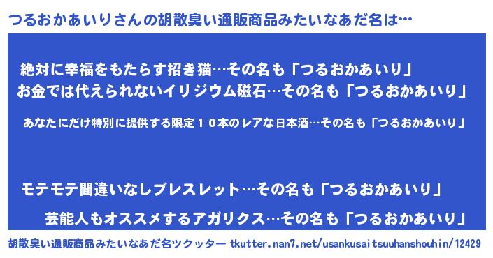 | 意味不明あだ名 | 『住所不定無職つるおかあいり(62歳)』 |