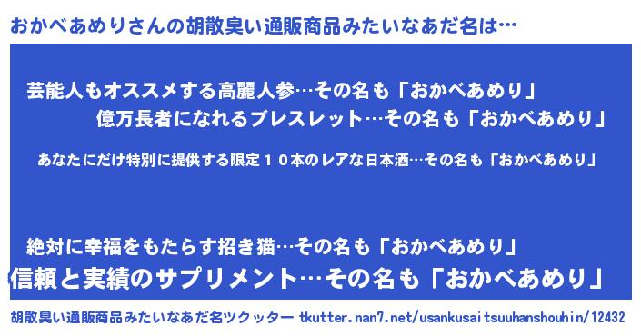 | 男性向けラノベタイトル風あだ名 | 『この素晴らしい世界におかべあめりを!』 |