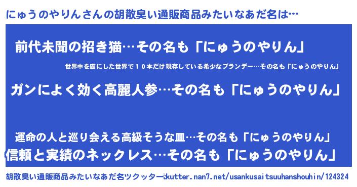 | 意味不明あだ名 | 『自称にゅうのやりん』 |