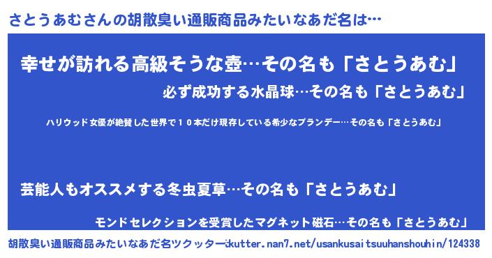 | 意味不明あだ名 | 『住所不定無職さとうあむ(98歳)』 |