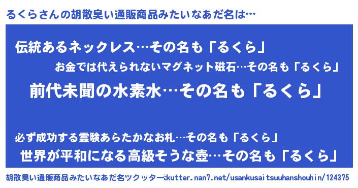 | 男性向けラノベタイトル風あだ名 | 『るくらに滅ぼされるだけの簡単なお仕事です』 |
