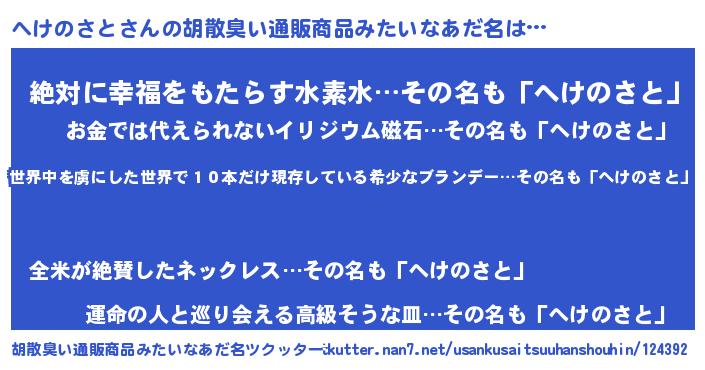| 男性向けラノベタイトル風あだ名 | 『この素晴らしい世界にへけのさとを!』 |