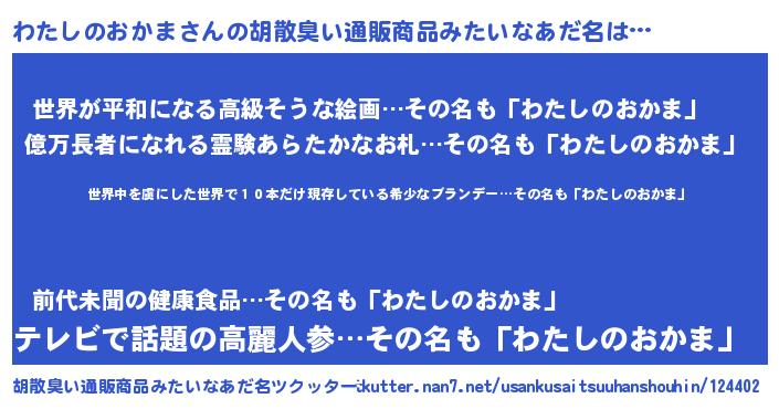 | 男性向けラノベタイトル風あだ名 | 『この素晴らしい世界にわたしのおかまを!』 |