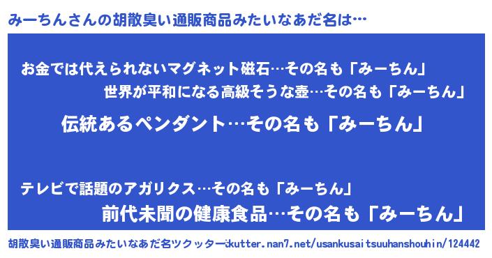| ヘコむあだ名 | 『みーぷりん』『みーちん(小並感)』 |
