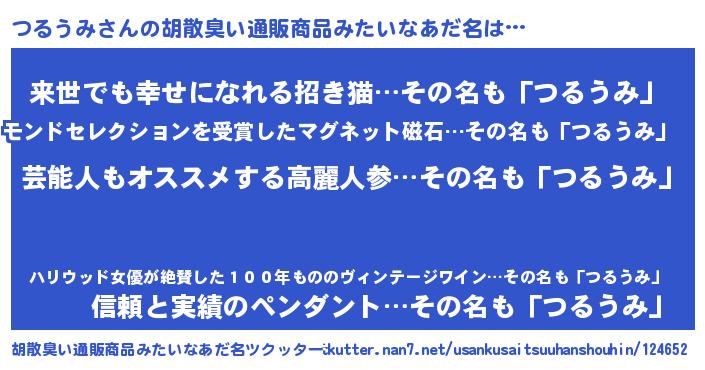 | 男性向けラノベタイトル風あだ名 | 『Re:つるうみから始める異世界生活』 |