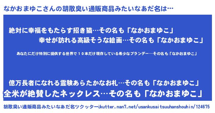 | ヘコむあだ名 | 『なかおまゆこ(苦笑)』『なかお』 |