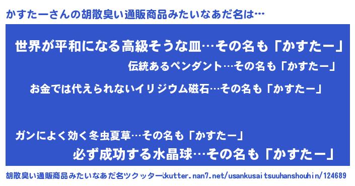 | 男性向けラノベタイトル風あだ名 | 『転生したらかすたーだった件』 |