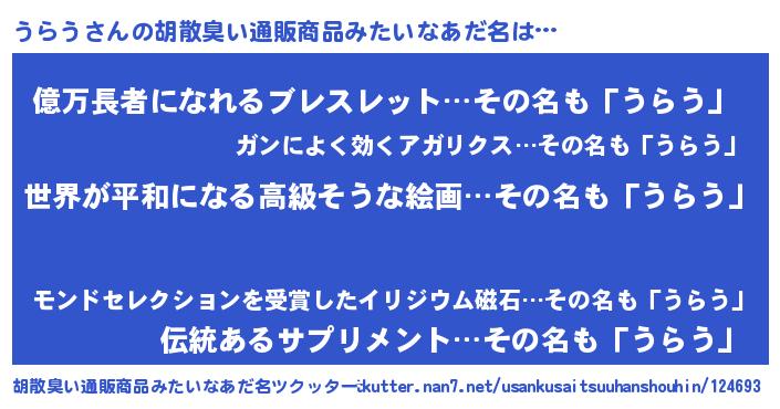 | 意味不明あだ名 | 『うらうフォーエバー』『ペロリンうらう』 |
