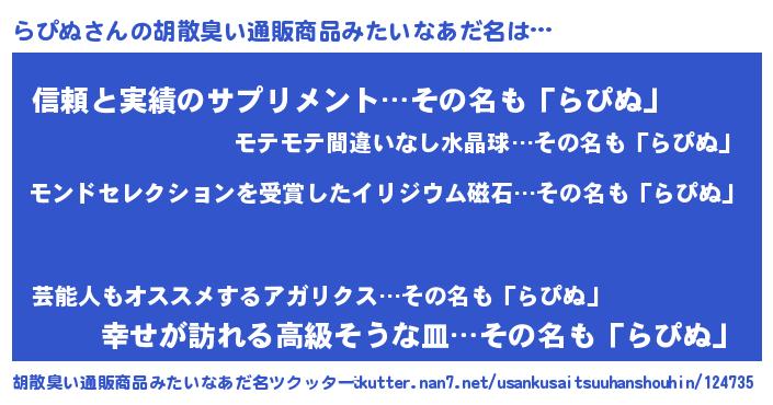 | 男性向けラノベタイトル風あだ名 | 『らぴぬ~年齢イコール彼女いない歴の魔法使い~』 |