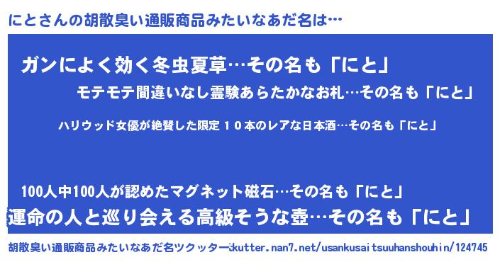 | 意味不明あだ名 | 『住所不定無職にと(62歳)』『自称にと』 |