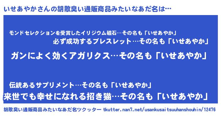 | ヘコむあだ名 | 『いせあやか(爆)』『いせもー』 |