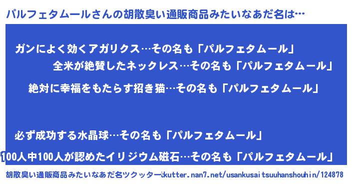 | 男性向けラノベタイトル風あだ名 | 『パルフェタムールという概念が存在しない退屈な世界 』 |