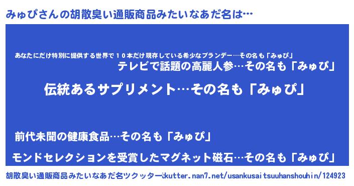 | 意味不明あだ名 | 『とにかく怪しいみゅぴ』『自称みゅぴ』 |