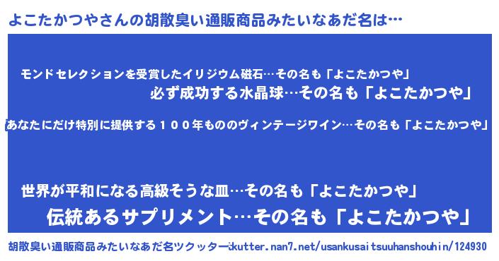| 男性向けラノベタイトル風あだ名 | 『よこたかつや~年齢イコール彼女いない歴の魔法使い~』 |