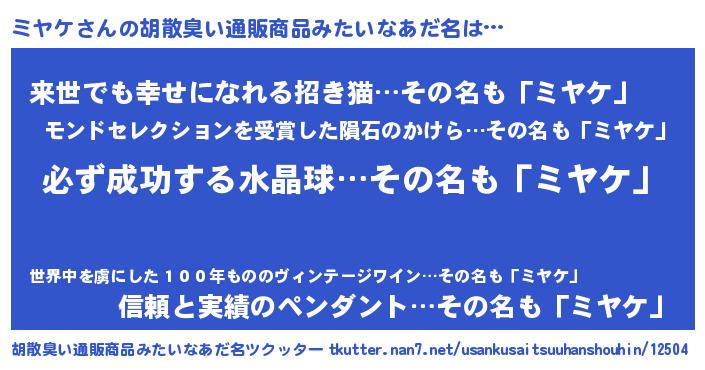 | 男性向けラノベタイトル風あだ名 | 『緋弾のミヤケ』 |