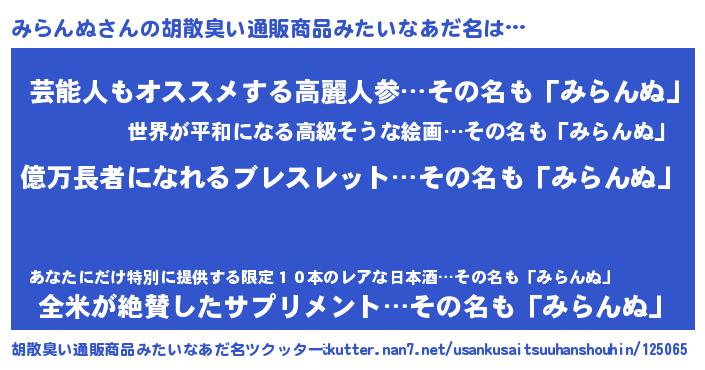 | 男性向けラノベタイトル風あだ名 | 『みらんぬ~年齢イコール彼女いない歴の魔法使い~』 |