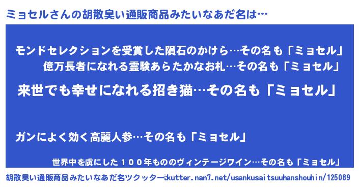 | ヘコむあだ名 | 『ミョセル(笑)』『ミョもー』 |