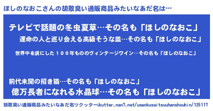| 恥ずかしいあだ名 | 『ホシノナオコデラックス』『ほしっちょ』 |