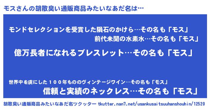 | 女子向けラノベタイトル風あだ名 | 『モスの玉の輿計画!』『モス様がみてる』 |