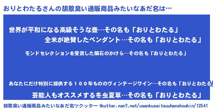 | 男性向けラノベタイトル風あだ名 | 『おりとわたるに滅ぼされるだけの簡単なお仕事です』 |