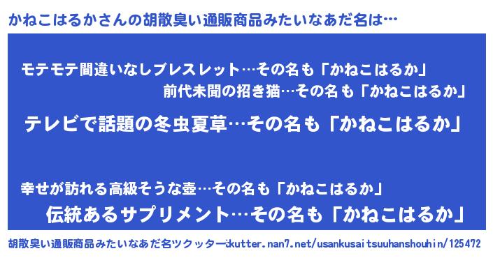 | 男性向けラノベタイトル風あだ名 | 『Re:かねこはるかから始める異世界生活』 |