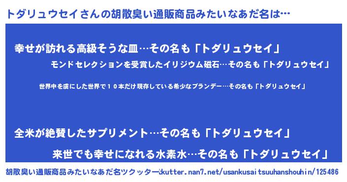 | 女子向けラノベタイトル風あだ名 | 『乙女ゲームの破滅フラグしかない悪役トダリュウセイに転生してしまった…』 |
