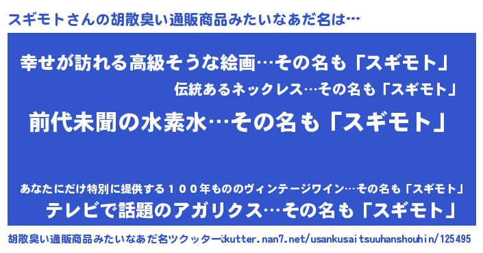 | 意味不明あだ名 | 『永久保存スギモト』『自称スギモト』 |