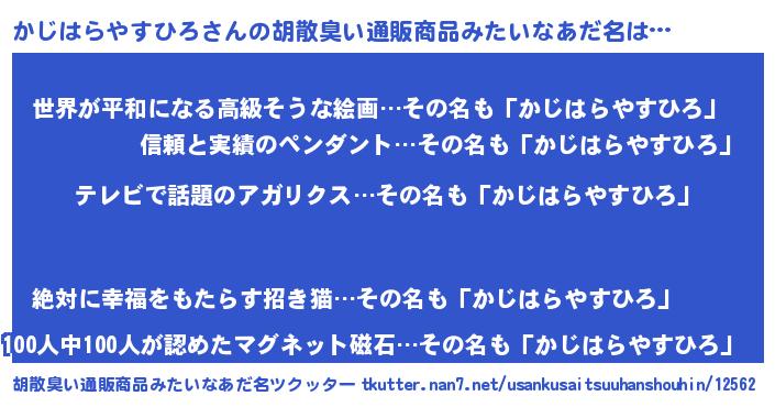 | 男性向けラノベタイトル風あだ名 | 『転生したらかじはらやすひろだった件』 |