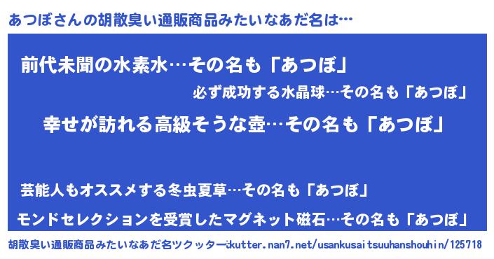 | 意味不明あだ名 | 『めかぶ科あつぼ属』『永久保存あつぼ』 |