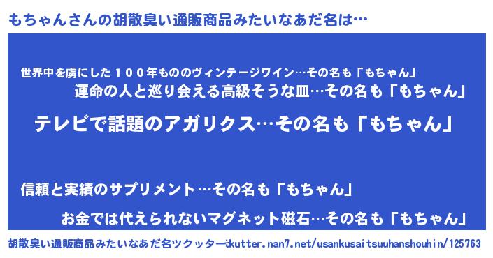 | 意味不明あだ名 | 『自称もちゃん』『めかぶ科もちゃん属』 |