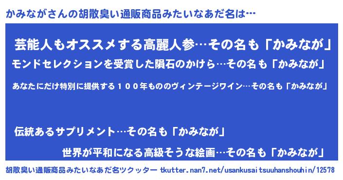| 意味不明あだ名 | 『住所不定無職かみなが(6歳)』 |