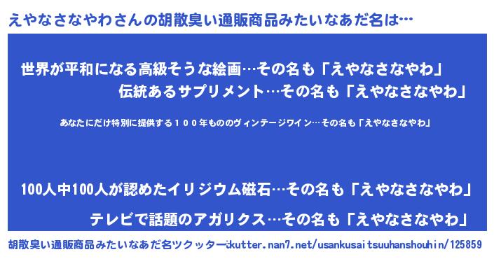 | 男性向けラノベタイトル風あだ名 | 『えやなさなやわ~年齢イコール彼女いない歴の魔法使い~』 |