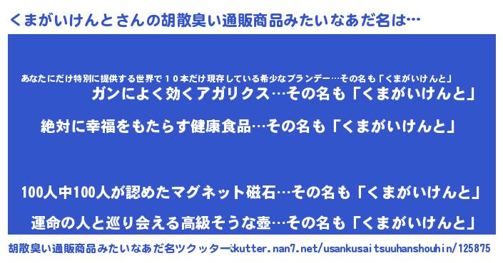 | 男性向けラノベタイトル風あだ名 | 『くまがいけんとという概念が存在しない退屈な世界 』 |