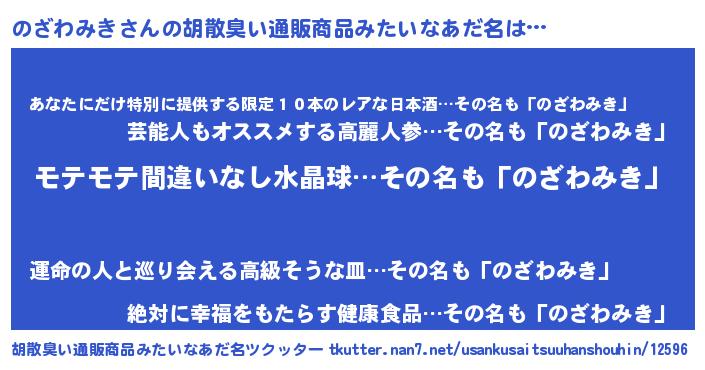 | ヘコむあだ名 | 『のざにゅー』『のざわみき(遠い目)』 |