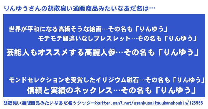 | 男性向けラノベタイトル風あだ名 | 『りんゆう~年齢イコール彼女いない歴の魔法使い~』 |