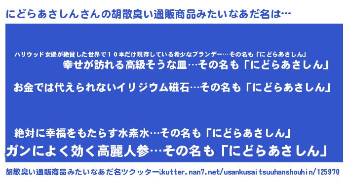| ヘコむあだ名 | 『なまこ酢』『にどらあさしん(震え声)』 |
